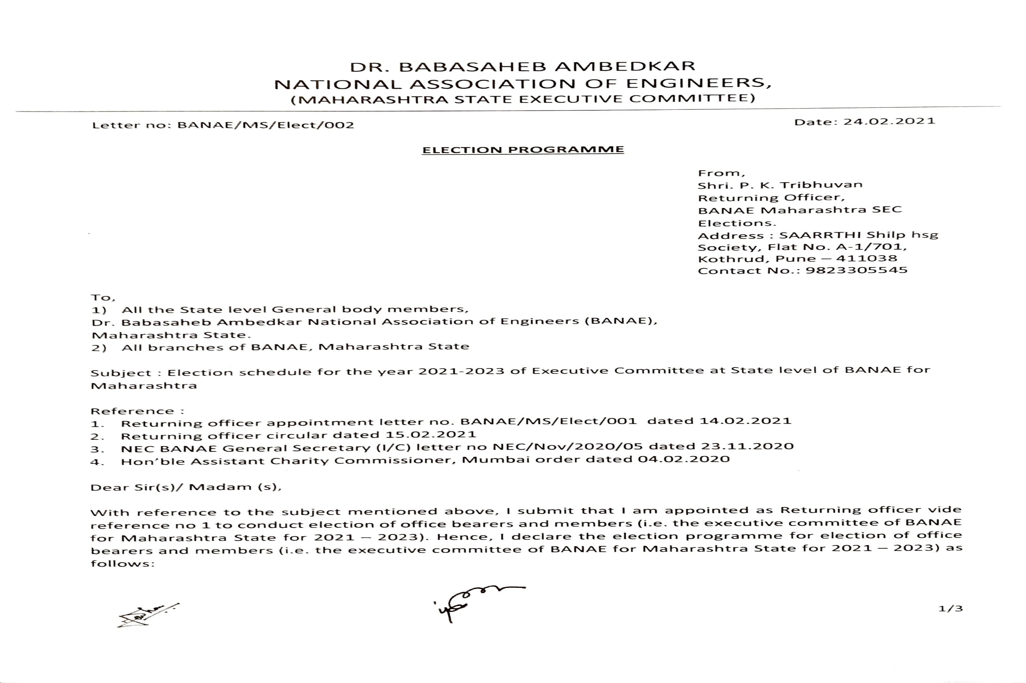 Subject : Election schedule for the year 2021-2023 of Executive Committee at State level of BANAE for Maharashtra.