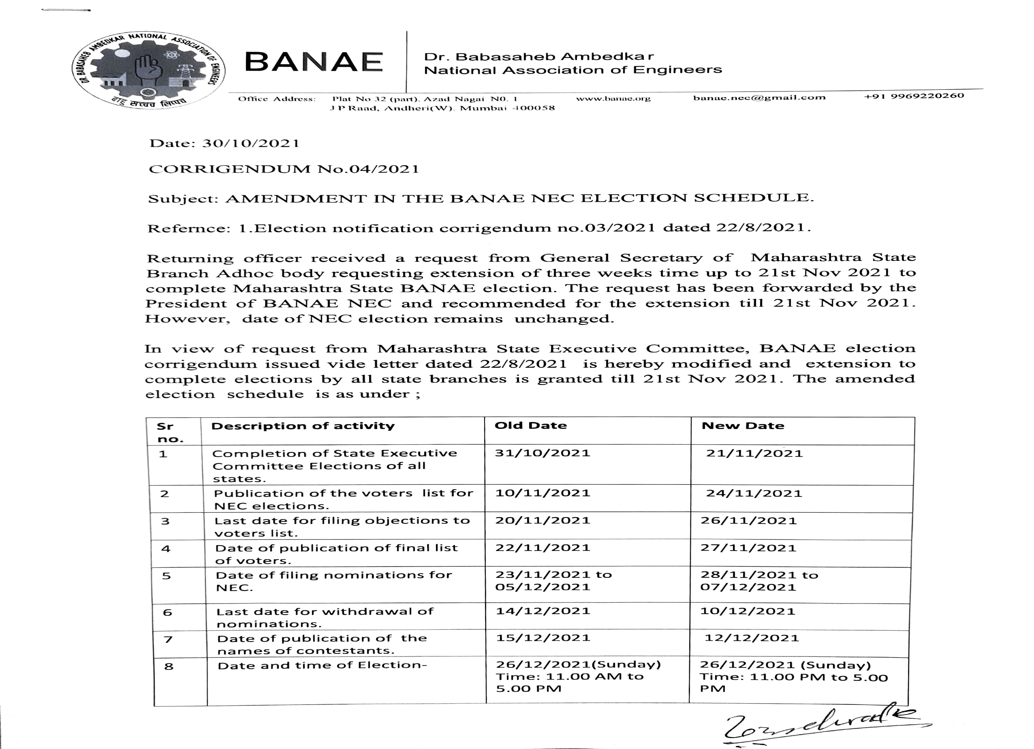 BANAE NEC Election - Corrigendum no 04 dated 30.10.2021