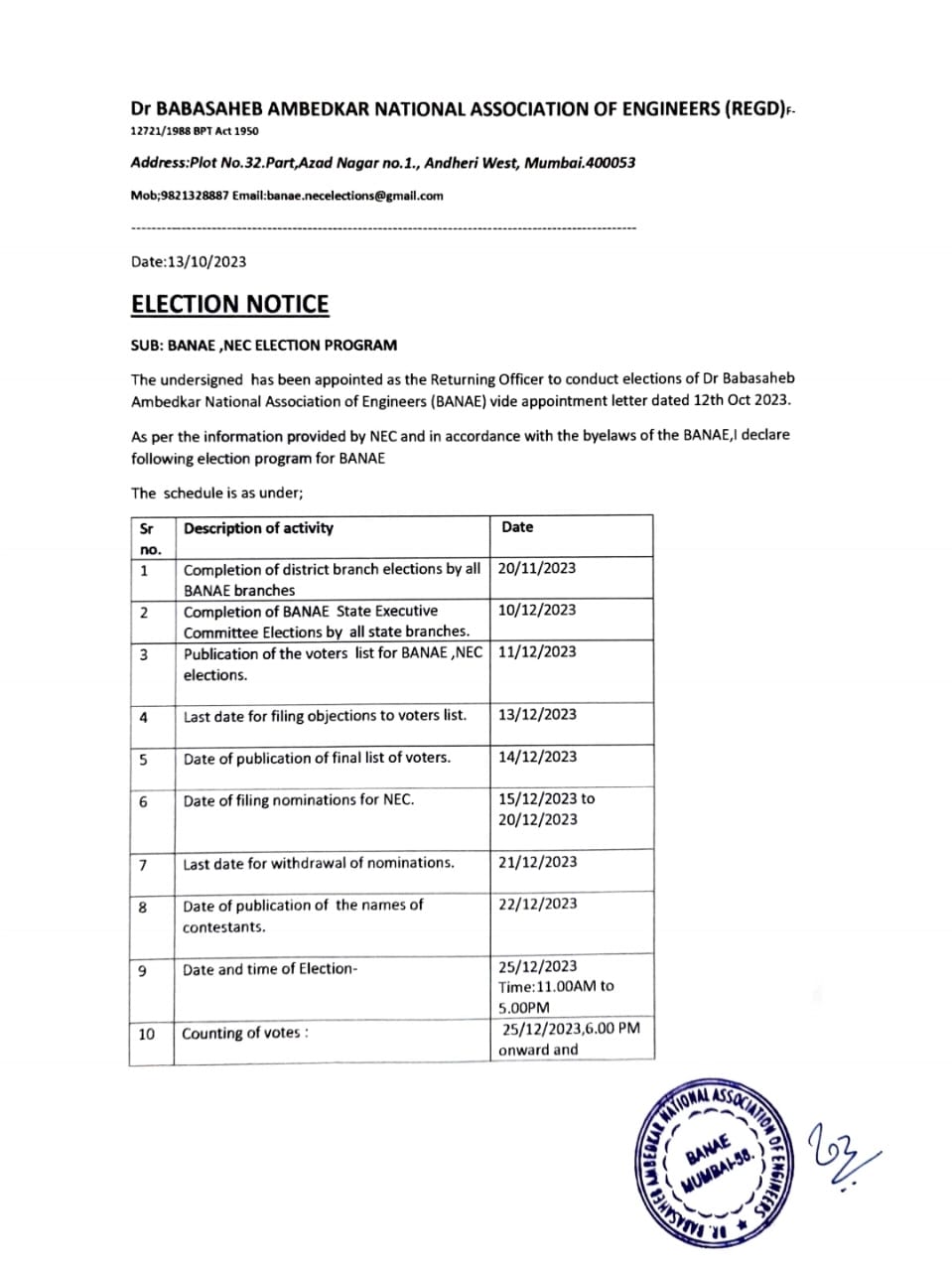 BANAE Elections 2023-25 Notifications Posted on 25/10/2023 - 09:42 PM https://drive.google.com/file/d/1fZScK6eA4Rp8kwA3-N6aJxwr7v8V6O7M/view?usp=drive_link